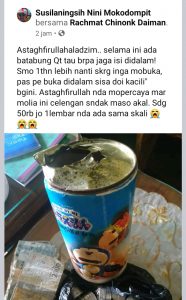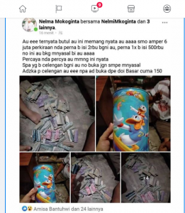 Tak lama kemudian, Susilaningsih Mokodompit, dalam unggahannya mengaku kehilangan uang dengan nominal Rp 50.000 dan Rp 20.000 saat membuka celengannya.