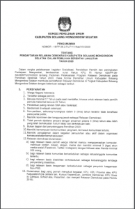 Berdasarkan pengumuman yang dikeluarkan KPU Bolsel dengan nomor: 18/PP.06.2-Pu/7111/Kab/VIII/2020 tentang Pendaftaran Relawan Demokrasi Kabupaten Bolsel Dalam Pemilihan Serentak Lanjutan Tahun 2020. Hal ini juga merujuk pada kegiatan Sosialisasi, Pendidikan dan Peningkatan Partisipasi Masyarakat, berdasarkan surat Ketua KPU RI nomor 630/PP. 06- SD/06 KPU/VIII/2020 tentang Pedoman Pelaksanaan Program Relawan Demokrasi Pada Pemilihan Serentak Tahun 2020.
