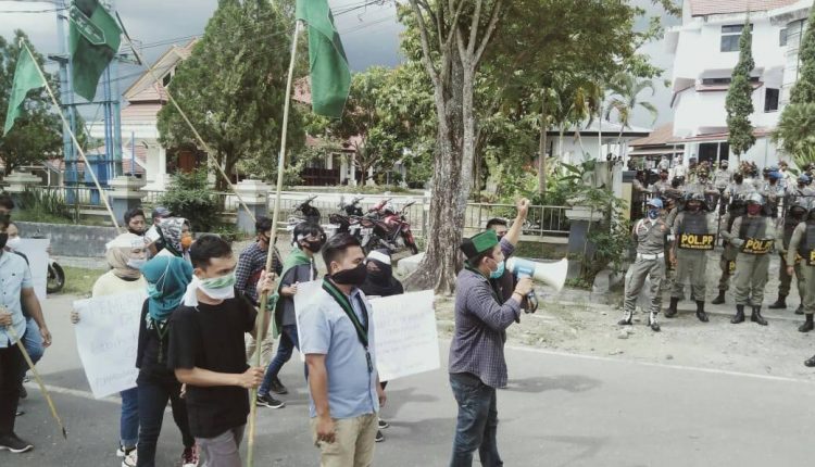 BERANDAKOTA—Puluhan pemuda yang tergabung dalam Himpunan Mahasiswa Islam (HMI) Cabang Bolaang Mongondow Raya (BMR) menyampaikan aspirasinya ke Kantor DPRD Kotamobagu, Kamis (8/10).