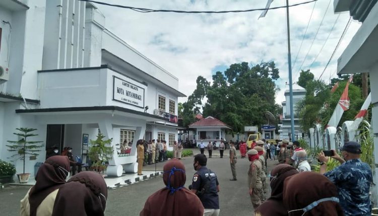 BERANDAKOTA— Sejumlah Pimpinan Organisasi Perangkat Daerah (OPD) dan unsur Forum Pimpinan Kepala Daerah (Forkompimda) mengikuti apel gabungan Satgas Penanganan Covid-19 yang dipimpin langsung oleh Walikota Kotamobagu, Ir Tatong Bara di halaman kantor Walikota, Senin (12/10).