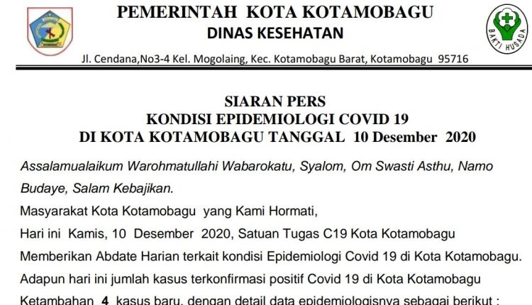 BERANDAKOTA – Satuan Gugus Tugas Covid-19 Kota Kotamobagu kembali memberikan update harian terkait kondisi Epidemiologi Covid-19 di Kotamobagu. Pasien positif Covid-19 kembali bertambah empat kasus, Kamis (10/12).