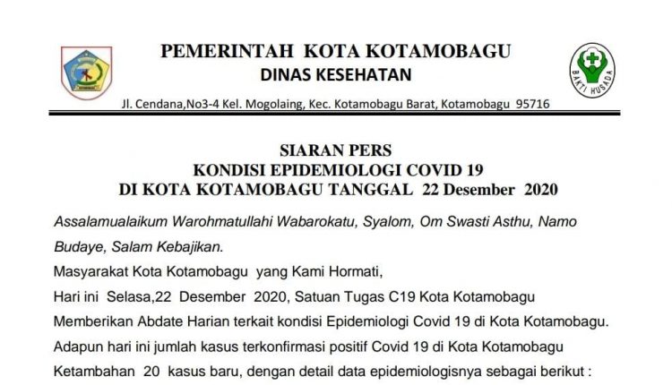 BERANDAKOTA – Hingga Selasa 22 Desember 2020, kasus virus Corona (Covid-19) masih menunjukkan angka peningkatan yang signifikan. Dalam rilis Satuan Gugus Tugas (Satgas) Covid-19 Kota Kotamobagu, kembali bertambah 20 kasus.