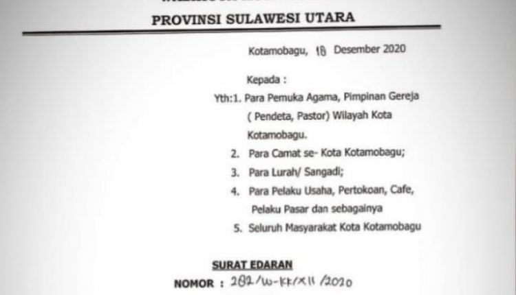Surat Edaran (SE) Menteri Agama Republik Indonesia nomor 23 tahun 2020 tentang panduan penyelenggaraan ibadah Natal di masa Pandemi Covid-19, dan hasil rapat koordinasi Satgas Covid-19 di Kota Kotamobagu, menjadi dasar terbitnya SE nomor 282/W-KK/XII/2020 tentang mengatur sejumlah poin-poin penting terkait aturan dalam melaksanakan ibadah perayaan Natal di tengah Pandemi Covid-19.