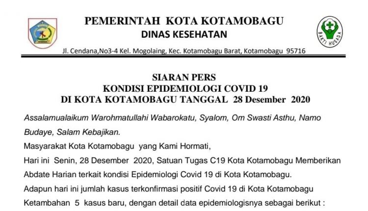 BERANDAKOTA – Empat hari menjelang tahun baru 2021, kasus positif Covid-19 di Kota Kotamobagu terus mengalami kenaikan. Data terbaru satuan gugus tugas (Satgas) Penanganan Covid-19 Kotamobagu, kasus positif Covid-19 bertambah 5 orang, Senin (28/12).