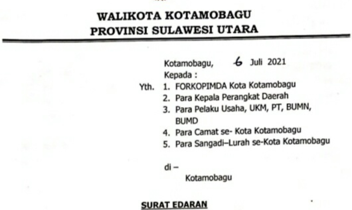 Adapun surat tersebut ditujukan terutama kepada para Pelaku Usaha, UKM, PT, BUMN, dan BUMD, serta para Camat dan Sangadi/Lurah se Kota Kotamobagu.