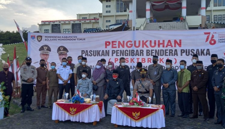 BERANDAKOTA – Pemerintah Kabupaten (Pemkab) Bolaang Mongondow Timur (Boltim), Bupati Sam Sachrul Mamonto bersama Wakil Bupati  (Wabup) Oskar Manopo mengukuhkan 27 peserta pasukan pengibar bendera pusaka (Paskibraka) Boltim angkatan tahun 2021.