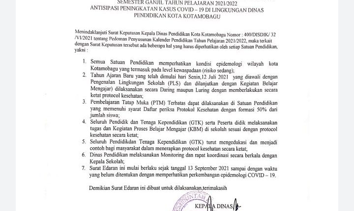 Hal ini sebagaimana surat yang dikeluarkan oleh Dinas Pendidikan Kota Kotamobagu pada 9 September 2021 lalu.