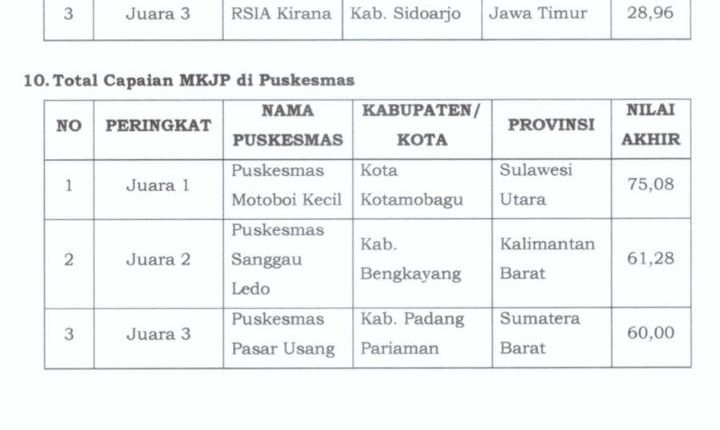 “Capaian MKJP Puskesmas Motoboi Kecil sesuai Keputusan Kepala BKKBN yakni 75,08 ditetapkan Peringkat Pertama di Indonesia menyusul Puskesmas Sanggau Ledo di Kalimantan Barat dan Puskesmas Pasar Usang di Sumatera Barat,” ujar Kepala Dinas Pengendalian Penduduk dan Keluarga Berencana (Dinas PP-KB) Kota Kotamobagu, Yani Umar SE, menjawab pertanyaan Kotamobagu Post, Selasa, (21/09).