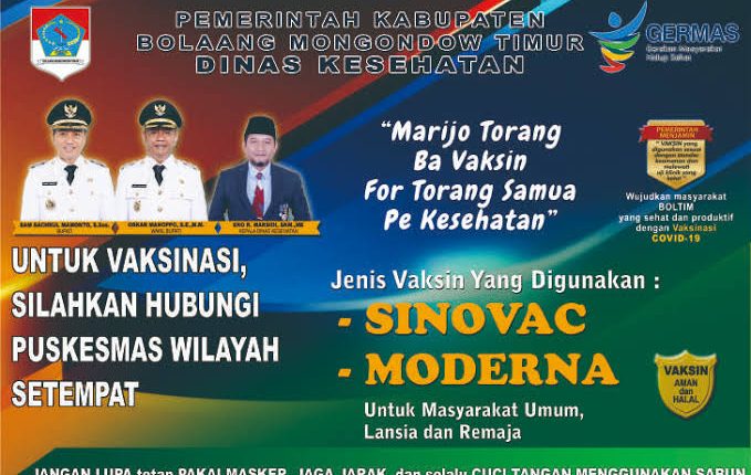 Adapun penyuntikan vaksin bagi masyarakat diwilayah Kabupaten Boltim akan dilaksanakan serentak di tujuh titik mulai dari wilayah kerja Puskesmas Mooat di SMP Satap Kokapoi, Puskesmas Tutuyan di Desa Togid, Puskesmas Nuangan di Desa Nuangan Satu, Puskesmas Kotabunan di Desa Kotabunan Barat, Puskesmas Modayag Barat di MTS Bongkudai, Puskesmas Motongkad di SMP Negeri 2 Nuangan (Motongkad), dan Puskesmas Buyat di Desa Buyat Induk.