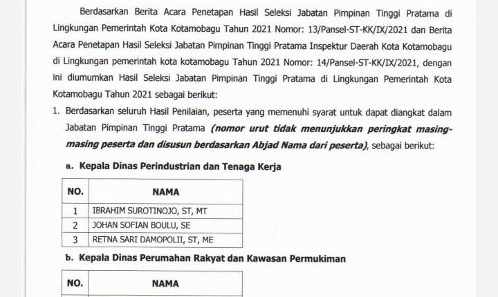 BERANDAKOTA – Hasil penilaian seleksi Jabatan Pimpinan Tinggi (JPT) Pratama di Lingkungan Pemerintah Kotamobagu resmi diumumkan oleh Panitia Seleksi (Pansel), Kamis, 30 September 2021.