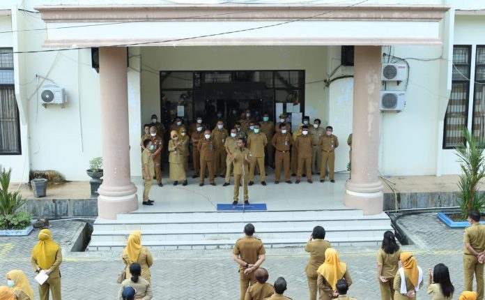 BERANDAKOTA – Bupati Bolaang Mongondow Timur (Boltim) Sam Sachrul Mamonto, memimpin apel bersama seluruh jajaran ASN dan THL, di halaman Kantor Bupati, Senin pagi 18 Oktober 2021.