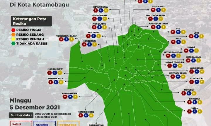 Peta yang dirilis Minggu 5 Desember 2021 tersebut, mencakup desa dan kelurahan di wilayah Kotamobagu, yang menunjukkan zona hijau atau nol kasus.
