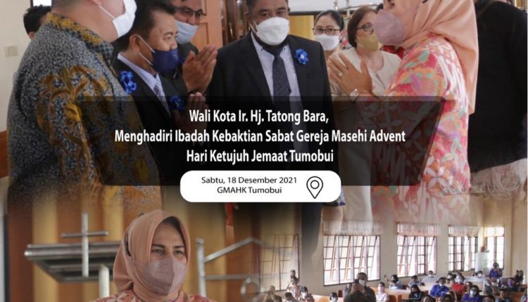 BERANDAKOTA—Wali Kota Kotamobagu, Ir. Hj. Tatong Bara, menghadiri Ibadah Kebaktian Sabat Gereja Masehi Advent Hari Ketujuh (GMAHK) Jemaat Tumobui, Sabtu (18/12), di GMAHK Tumobui, Kecamatan Kotamobagu Timur, Kota Kotamobagu.