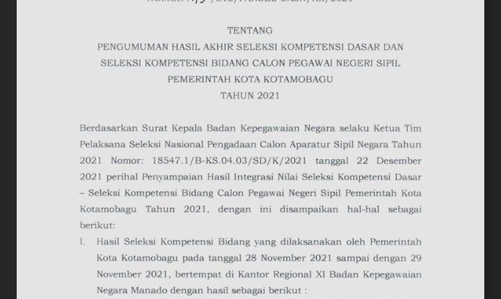 Hal itu sebagaimana Surat Pengumuman Walikota Kotamobagu Nomor: 43/813/PANSEL-CASN/XII/2021 tentang Pengumuman Hasil Akhir Seleksi Kompetensi Dasar dan Seleksi Kompetensi Bidang Calon Pegawai Negeri Sipil Pemerintah Kota Kotamobagu Tahun 2021.