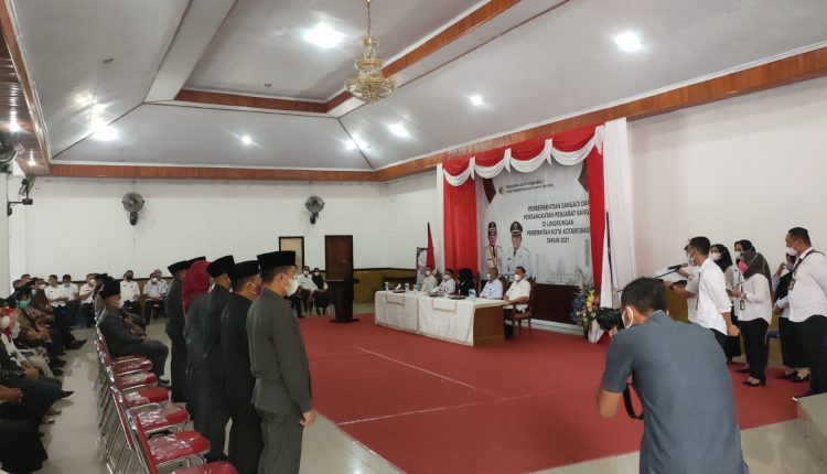 BERANDAKOTA – Pemerintah Kotamobagu Mengelar pelantikan pejabat sangadi, di aula Rumah Dinas Walikota Rabu (29/12)