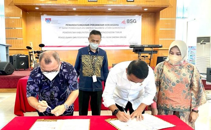 BERANDAKOTA – Bupati Bolaang Mongondow Timur (Boltim) Sam Sachrul Mamonto bersama Direktur Umum PT Bank Sulut-Go Joubert Dondokambey menandatangani perjanjian kerjasama tentang Pengelolaan dan Penyimpanan Rekening Kas Umum Daerah (RKUD), Kamis, 27 Januari 2022.