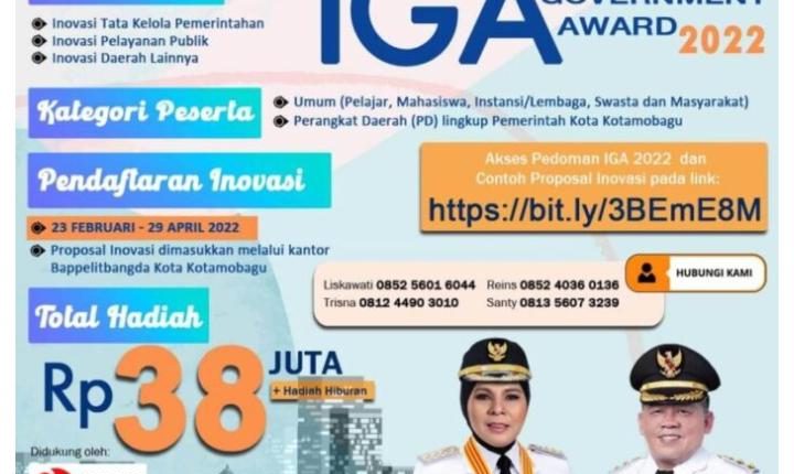 BERANDAKOTA – Pemerintah Kota Kotamobagu melalui Badan Perencanaan Penelitian dan Pengembangan Daerah (Bappelitbangda) kembali menggelar lomba inovasi daerah yang terbuka untuk semua kalangan dengan nama kegiatan Innovative Government Award (IGA) tahun 2022.