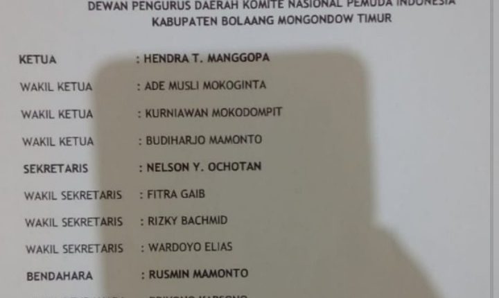 Dalam SK nomor: Kep.03/C/DPD KNPI-SULUT/III/2022 yang ditandatangani Ketua DPD KNPI Provinsi Sulut Rio Dondokambey dan Sekretaris DPD KNPI Provinsi Sulut Arie S Mokodompit, terlampir susunan dan personalia kepengurusan caretaker DPD KNPI Boltim. Dipercaya sebagai Ketua adalah Hendra Manggopa, Sekretaris Nelson Ochotan dan Bendahara Rusmin Mamonto. Selain itu, terdapat pula beberapa nama yang masuk dalam jajaran wakil ketua, wakil sekretaris dan wakil bendahara.