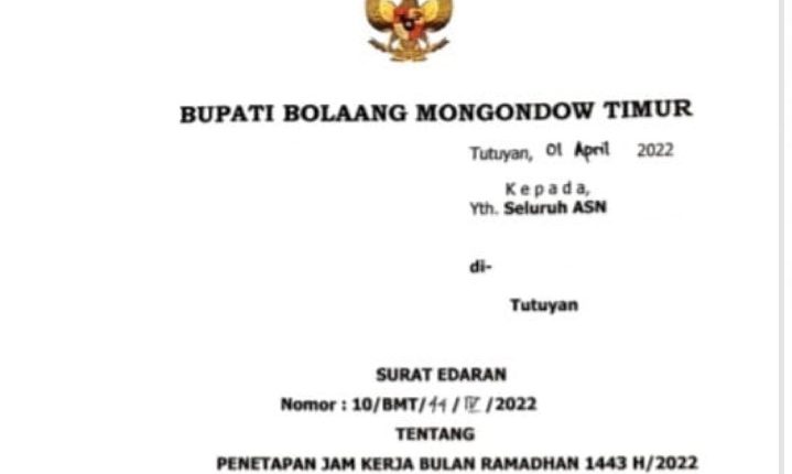 BERANDAKOTA – Pemerintah Kabupaten (Pemkab) Bolaang Mongondow Timur (Boltim), mengeluarkan surat edaran Nomor : 10/BMT/44/IV/2022 tentang penetapan jam kerja selama Bulan Ramadhan 1443 Hijriah kepada seluruh Aparatur Sipil Negara (ASN) di lingkungan Pemkab Boltim, Jumat (1/4).