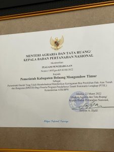 “Pemkab Boltim berterima kasih dengan adanya penghargaan ini. Tentunya ini merupakan bentuk dukungan Pemkab Boltim dalam suksesnya program Nasional PTSL,” ujar Bupati Sachrul.