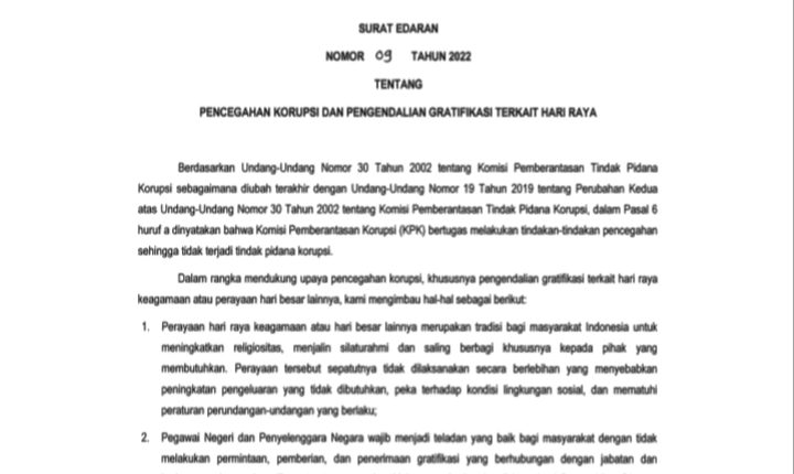 Hal ini sesuai surat edaran Komisi Pemberantasan Korupsi (KPK) RI Nomor 09 Tahun 2022 Tentang Pencegahan Korupsi dan Pengendalian Gratifikasi Terkait Hari Raya.