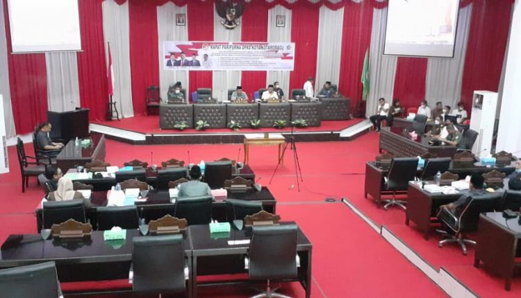 Dalam agenda pembicaraan tingkat II tentang penetapan 4 (empat) rancangan peraturan daerah (Ranperda), masing-masing Ranperda pengendalian dan pengawasan menara telekomunikasi, pengelolaan sampah, tata cara penyelenggaraan pemilihan Sangadi serta penegakan hukum protokol kesehatan Covid-19.