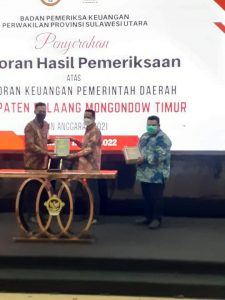 Bupati kabupaten bolaang mongondow timur (Boltim) Sam Sachrul Mamonto (SSM) menerima langsung laporan hasil pemeriksaan (LHP) LPKD dari kepala BPK RI perwakilan sulawesi utara (Sulut) Karyadi. Jumat 13 Mei 2022.