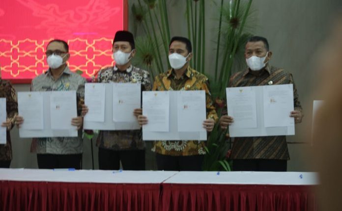 BERANDAKOTA – Bupati Bolaang Mongondow Timur (Boltim), Sam Sachrul Mamonto (SSM) bersama kepala daerah se-Sulut, menandatangani nota kesepahan antara Badan Pembinaan Ideologi Pancasila (BPIP) Republik Indonesia dengan Pemerintah daerah Provinsi dan Kabupaten Kota.