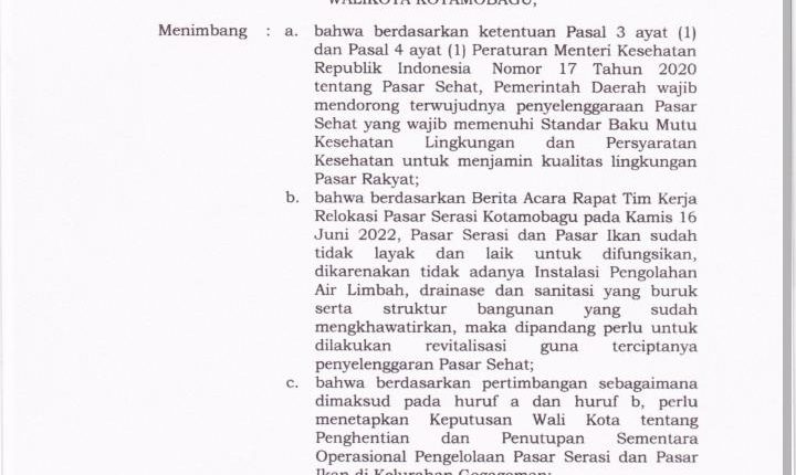 BERANDAKOTA – Kepala Bagian Hukum Setda Kota Kotamobagu Rendra Dilapanga, SH., M.Si., kembali memberikan penjelasan terkait Surat Keputusan Walikota Kotamobagu Nomor 215 tertanggal 2 Agustus 2022 tentang Penghentian dan Penutupan Sementara Operasional Pengelolaan Pasar Serasi dan Pasar Ikan di Kelurahan Gogagoman.