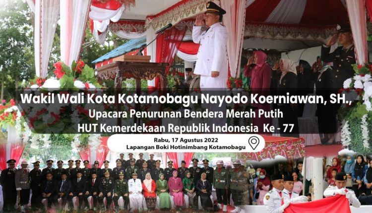 BERANDAKOTA—Wakil Wali Kota Kotamobagu, Nayodo Koerniawan, SH bertindak sebagai Inspektur Upacara (Irup) pada upacara penurunan bendera merah putih, dalamrangka memperingati Hari Ulang Tahun ke – 77 Kemerdekaan Republik Indonesia, Rabu (17/8) sore.