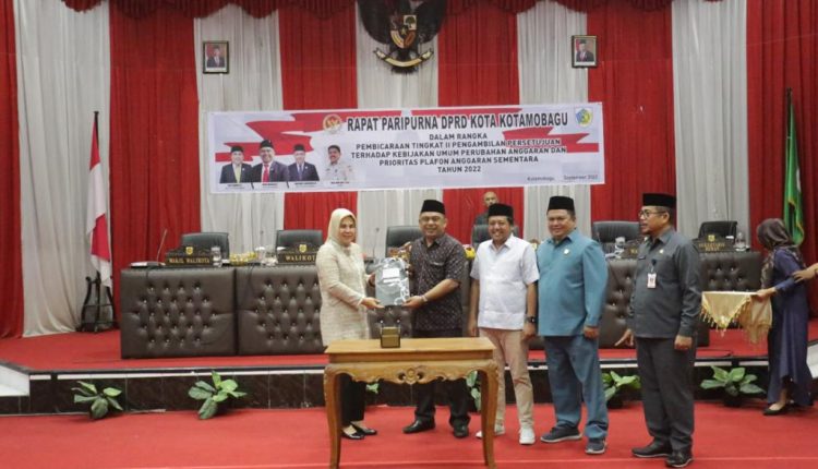 BERANDAKOTA—Wali Kota Ir. Hj. Tatong Bara bersama Pimpinan DPRD Kota Kotamobagu menandatangani Dokumen Nota Kebijakan Umum Perubahan Anggaran dan Prioritas Plafon Anggaran Sementara Perubahan (KUPA PPASP)Tahun 2022 pada Rapat Paripurna Pembicaraan Tingkat II Pengambilan Persetujuan terhadap Kebijakan Umum Perubahan Anggaran dan Prioritas Plafon Anggaran Sementara Tahun 2022, Selasa (27/9) malam di Ruang Rapat Paripurna DPRD Kota Kotamobagu Jalan Paloko Kinalang.