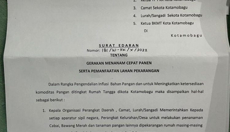 BERANDAKOTA – Dalam rangka pengendalian inflasi bahan pangan dan untuk meningkatkan ketersediaan komiditas pangan di tingkat rumah tangga, Pemerintah Kota Kotamobagu menerbitkan Surat Edaran Walikota Nomor 181/W-KK/X/2022, tanggal 27 Oktober 2022 tentang Gerakan Menanam Cepat Panen serta Pemanfaatan Lahan Pekarangan.