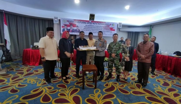 Usai pelaksanan Paripurna, pimpinan dan anggota DPRD Kotamobagu serta Wali Kota Kotamobagu dan pejabat Pemkot Kotamobagu, memberi suprise Hari Ulang Tahun (HUT) Kapolres Kotamobagu AKBP Dasveri Abdi. (Fjr)