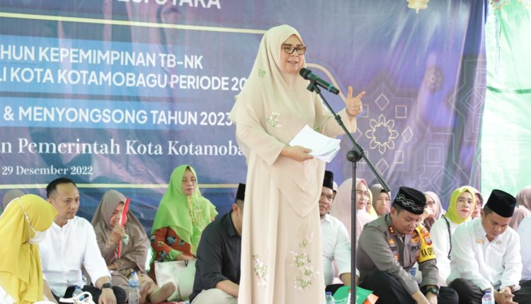BERANDAKOTA—Wali Kota Kotamobagu, Ir. Hj. Tatong Bara menghadiri Tabligh Akbar dalam rangka Syukuran 4 Tahun Kepemimpinan Ir. Hj, Tatong Bara dan Nayodo Koerniawan, S.H, (TB – NK) dan mengakhiri Tahun 2022 serta menyongsong Tahun 2023, yang dilaksanakan Pengurus Daerah Badan Kontak Majelis Taklim (BKMT) Kota Kotamobagu dan Pemerintah Kota Kotamobagu, Kamis (29/12).