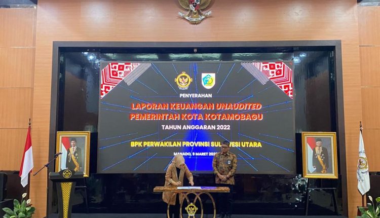 BERANDAKOTA – Wali Kota Kotamobagu Ir. Hj. Tatong Bara, menyerahkan Laporan Keuangan Pemerintah Daerah (LKPD) Unaudited Pemerintah Kota Kotamobagu Tahun Anggaran 2022, Kamis (9/2), di Gedung BPK RI Perwakilan Sulawesi Utara, Jalan 17 Agustus Manado.