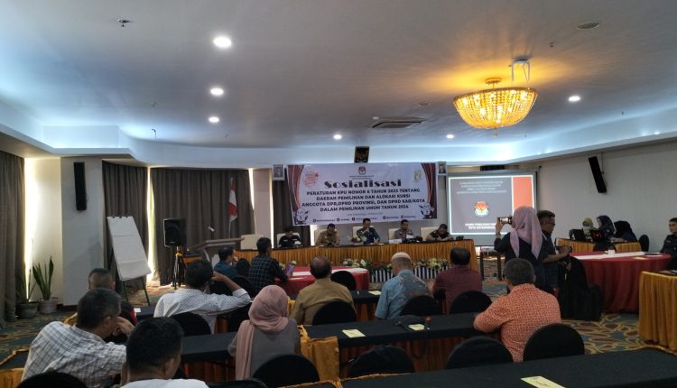 BERANDAKOTA – mewakili Walikota Kotamobagu Asisten I Nasli Paputungan menghadiri sosialisasi Peraturan Komisi Pemilihan Umum (PKPU) nomor 6 tahun 2023, tentang Daerah Pemilihan dan Alokasi Kursi Anggota DPR RI, DPRD Provinsi dan DPRD Kabupaten/Kota pada Pemilu tahun 2024.
