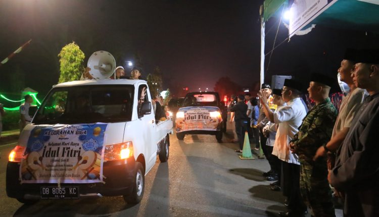 BERANDAKOTA—Wakil Wali Kota Kotamobagu, Nayodo Koerniawan, S.H., melepas peserta Pawai Takbir Keliling dalam rangka Hari Raya Idul Fitri 1444 Hijriah di wilayah Kota Kotamobagu, Jumat (21/4).