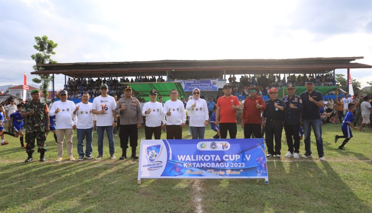 BERANDAKOTA—Wali Kota Kotamobagu, Ir. Hj. Tatong Bara didampingi Wakil Wali Kota Kotamobagu membuka secara resmi pelaksanaan kegiatan Open Tournament Sepak Bola Wali Kota Cup Tahun 2023, Minggu (28/5).