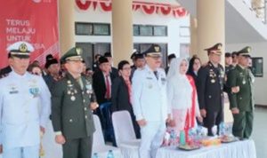 BERANDAKOTA – Bupati Bolaang Mongondow (Bolmong) Ir Limi Mokodompit MM bertindak sebagai Inspektur Upacara (Irup) dalam upacara perayaan Hari Ulang Tahun (HUT) Republik Indonesia (RI) ke-78, bertempat di halaman depan kantor Bupati, Lolak, Kamis (17/08).