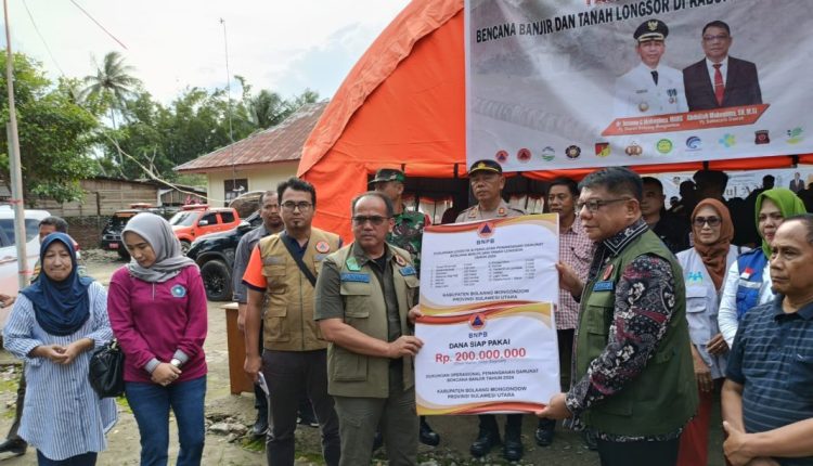Bantuan darurat yang telah diberikan BNPB kepada Pemkab Bolmong meliputi Dana Siap Pakai sebesar Rp. 200.000.000, serta berbagai logistik dan peralatan darurat untuk menghadapi banjir dan tanah longsor, antara lain: