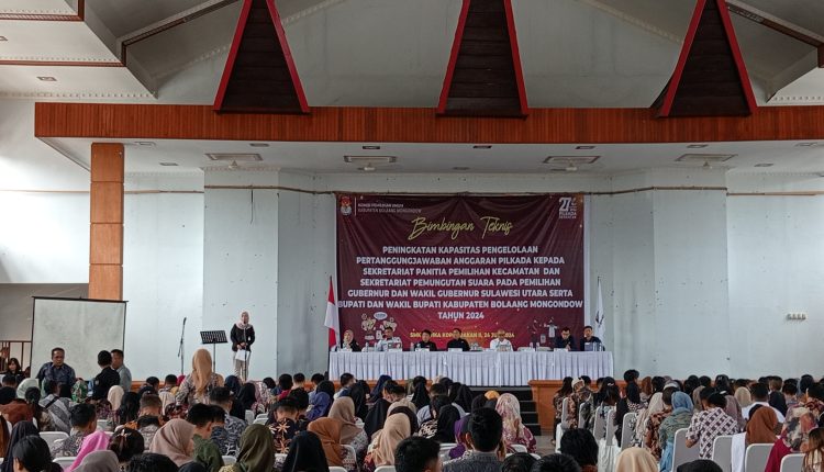 BERANDAKOTA- Komisi Pemilihan Umum (KPU) Bolaang Mongondow menggelar Bimbingan Teknis (Bimtek) peningkatan kapasitas pengelolaan pertanggungjawaban anggaran pemilihan kepala daerah (Pilkada) kepada sekretariat Panitia Pemilihan Kecamatan (PPK) dan sekretariat Pemungutan Suara (PPS) pada pemilihan Gubernur dan Wakil Gubernur Sulawesi Utara serta Bupati dan Wakil Bupati Kabupaten Bolaang Mongondow tahun 2024, kegiatan berlangsung di Aula Bagas Raya Yadika, Rabu (24/07).