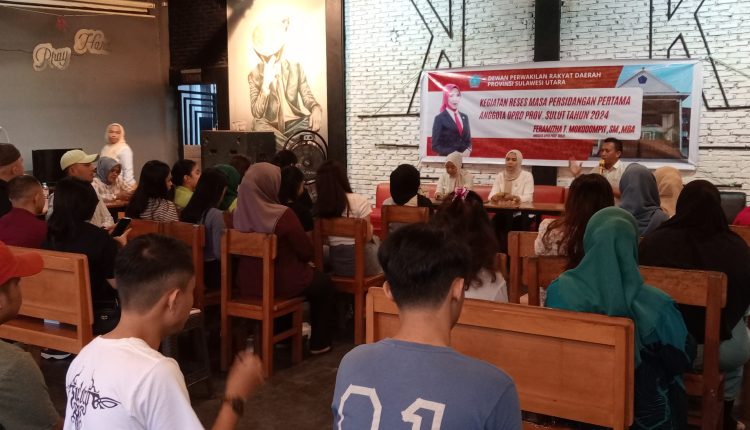 BERANDAKOTA— Anggota DPRD Provinsi Sulawesi Utara, Feramitha Tiffany Mokodompit, mengadakan kegiatan reses di Kafe Kusu-Kusu, Kelurahan Kotobangon, Kecamatan Kotamobagu Timur. Kegiatan ini dihadiri oleh berbagai kalangan, termasuk generasi milenial dan Lurah Kotobangon, Gika Angela Ginoga.