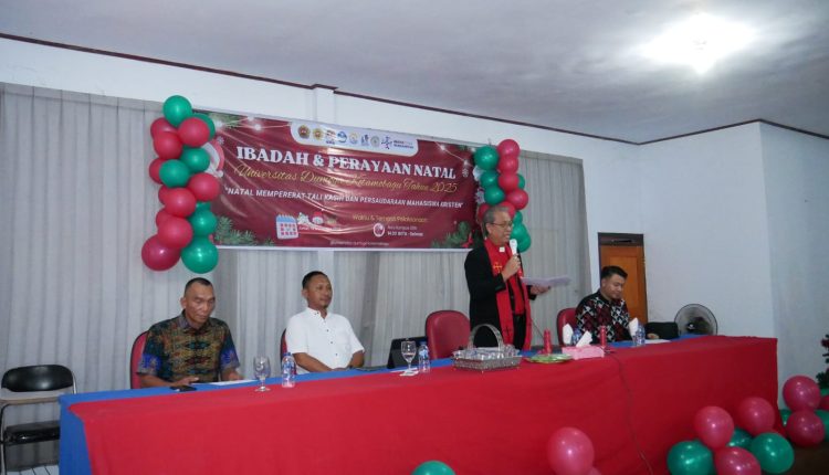 Berandakota, Kotamobagu – Universitas Dumoga Kotamobagu (UDK) menggelar ibadah pra Natal yang berlangsung khidmat di Aula Ruang Rapat Kampus UDK, Jum’at (19/12/2025), sebagai bagian dari penguatan nilai spiritual dan toleransi di lingkungan kampus.